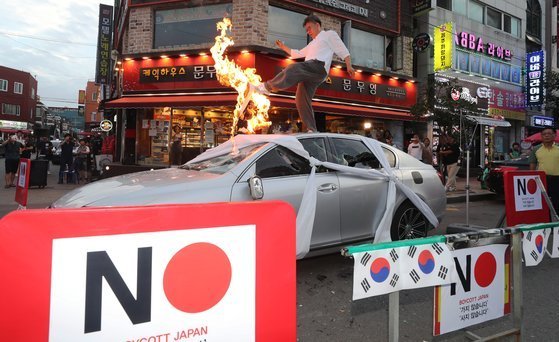 日本製品不買運動が全国的に広がっている中、仁川では、日本車をわざわざ壊した後、路上に展示するパフォーマンスが繰り広げられました。