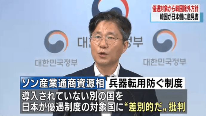韓国のソン・ユンモ産業通商資源相は24日午前10時からソウルで会見を開き、日本政府が輸出の手続きを簡略化する優遇措置の対象国から韓国を外す方針であることに対して「すべて根拠がなく、深い遺憾を示す」と述べ24日朝、日本側に意見書を送ったことを明らかにしました。