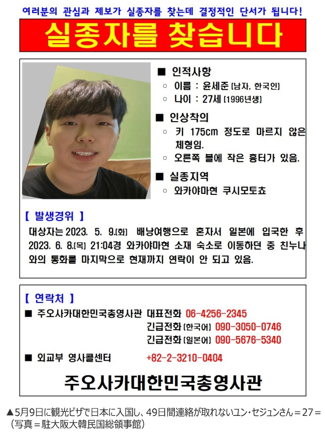 【写真】大阪の大韓民国総領事館が公開した行方不明中のユン・セジュンさんの顔写真