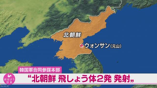 韓国軍合同参謀本部は、北朝鮮が25日朝、東部のウォンサン(元山)付近から日本海に向けて発射した2発の飛しょう体について、短距離ミサイルとみられるという分析を明らかにしました。