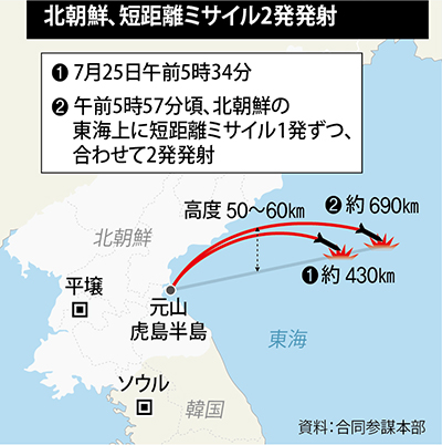 25日未明、5時34分と57分、北朝鮮の江原道元山(ウォンサン)の北側にある虎島(ホド)半島一帯で、北朝鮮の東海に向かって短距離ミサイル2発が発射された。合同参謀本部は「2発とも短距離ミサイルで、高度50キロメートル以上で、最初のものは430キロメートル、2発目は690キロメートルを飛んだ」と発表した。政府は国家安保会議(NSC)常任委員会会議の後、「新しい種類の短距離弾道ミサイルと見られる」と発表した。北朝鮮のミサイル発射は5月9日、平安北道の亀城市(クソンシ)で2発を東海に向かって打ち上げてから77日ぶりのことだ。
