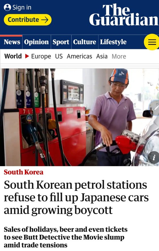 ガーディアンは24日(現地時間)、韓国で行われている反日ボイコットを集中照明した。ガーディアンは、「韓国と日本政府の間の貿易と政治的紛争で始まった日本製品のボイコットが広がり、韓国内の一部のガソリンスタンドや修理工場で日本産車のオイルを入れてくれない、または修理を拒否する現象も現れている」と伝えた。