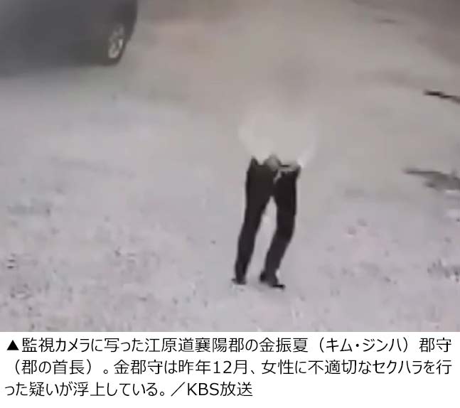 江原特別自治道襄陽郡の金振夏(キム・ジンハ)郡守が女性住民の前でズボンを下ろすなど不適切な行動を取り、また女性からの請願を解決する見返りに金品を受け取った疑惑も浮上している。問題が表面化したことを受け金郡守は所属する与党・国民の力を離党した。警察はすでに調査を開始している。