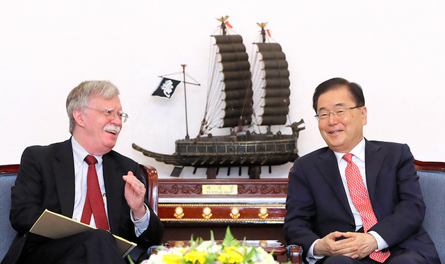 ジョン・ボルトン米大統領補佐官(国家安全保障問題担当)は24日、青瓦台で鄭義溶(チョン・ウィヨン)国家安保室長に会い、ホルムズ海峡派兵問題と韓米防衛費分担金問題を話し合った。