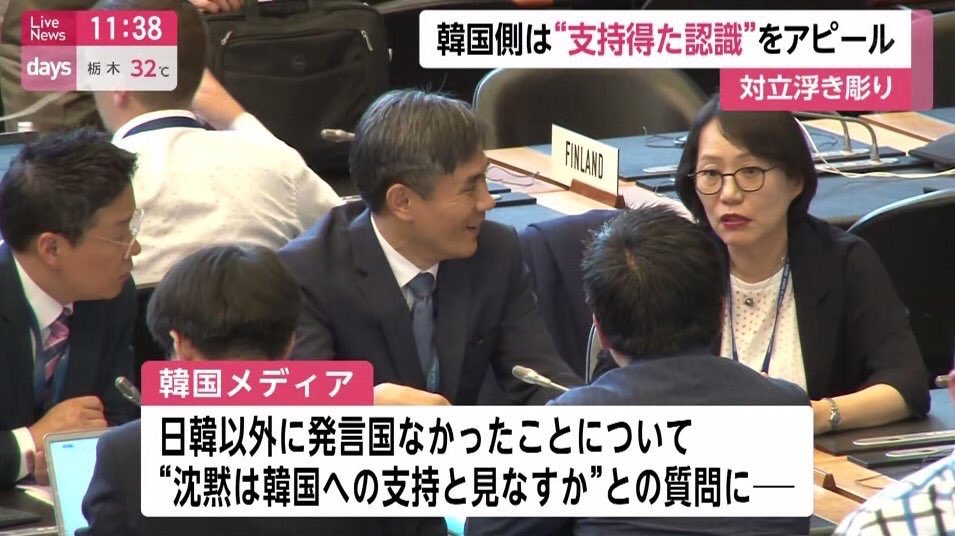 両国の議論は、平行線をたどった。韓国の発表によると、金勝鎬キムスンホ・産業通商資源省新通商秩序戦略室長は非公開の一般理事会で、日本の措置を「徴用工問題と関連した対立に起因したもの」と主張し、「自由公正な貿易を強調してきた日本が正反対の措置を韓国だけに特定して取った」と批判した。