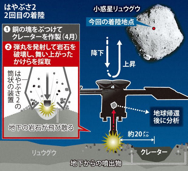 宇宙航空研究開発機構(JAXA)は25日、探査機「はやぶさ2」が小惑星リュウグウへの2回目の着陸に挑んだ際、目標地点からわずか60センチの地点に着陸していたことが分かったと発表した。はやぶさ2は今月11日、衝突装置を使って人工的に作ったクレーター近くへ着陸した。これまでの観測で、着陸した場所にはクレーターから噴出した物質が降り積もっているとみられており、目標としていた小惑星の地下物質の採取に成功したと考えられるという。