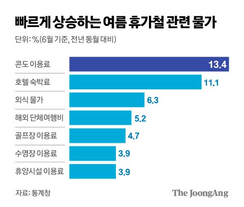 暑さが本格化し、夏休みの関連物価が急速に上昇していることが調査された。 9日、統計庁の国家統計ポータル(KOSIS)を見ると、6月のコンドミニアム利用料は昨年同月より13.4%上がった。 3月6.4%から4月6.6%、5月10.8%上昇したのに続き、4カ月連続増加傾向だ。 ホテル宿泊料は3月13.7%、4月13.5%、5月10.8%に続き、先月も前年比11.1%上昇した。