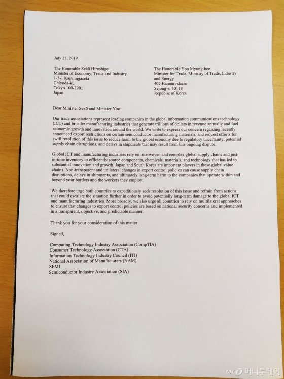 2. 미국기업협회(미국 최대 싱크탱크)에서, 공식 홈페이지에, 일본의 수출규제를 멈추라고 공개적으로 밝혔다. "일본은 어리석은 수출규제를 멈춰라" "일본의 수출규제는 중국만 도와준다." 이런 내용이였다. 미국의 싱크탱크는 사실상 미국 행정부의 주장을 대변하는 곳이다. 일본의 '일본회의' 같은 곳이다. 게다가 미국의 '존 볼턴'은 이곳 출신이다.