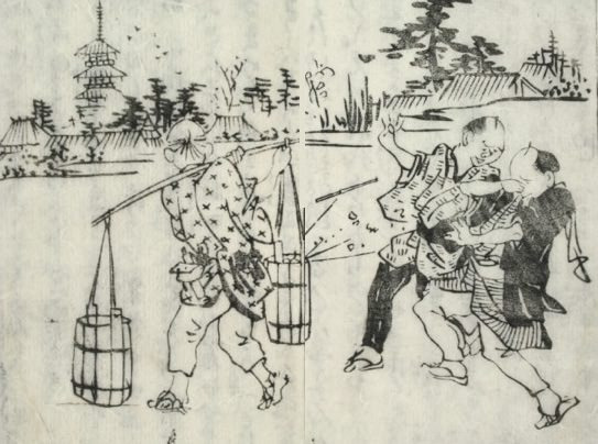 門前のゴミや牛馬の糞を放置するのは通り沿いの商家にとっては体面に関わるということで、小僧さん(下っ端の奉公人)がせっせと掃除、水打ちしていたのです。