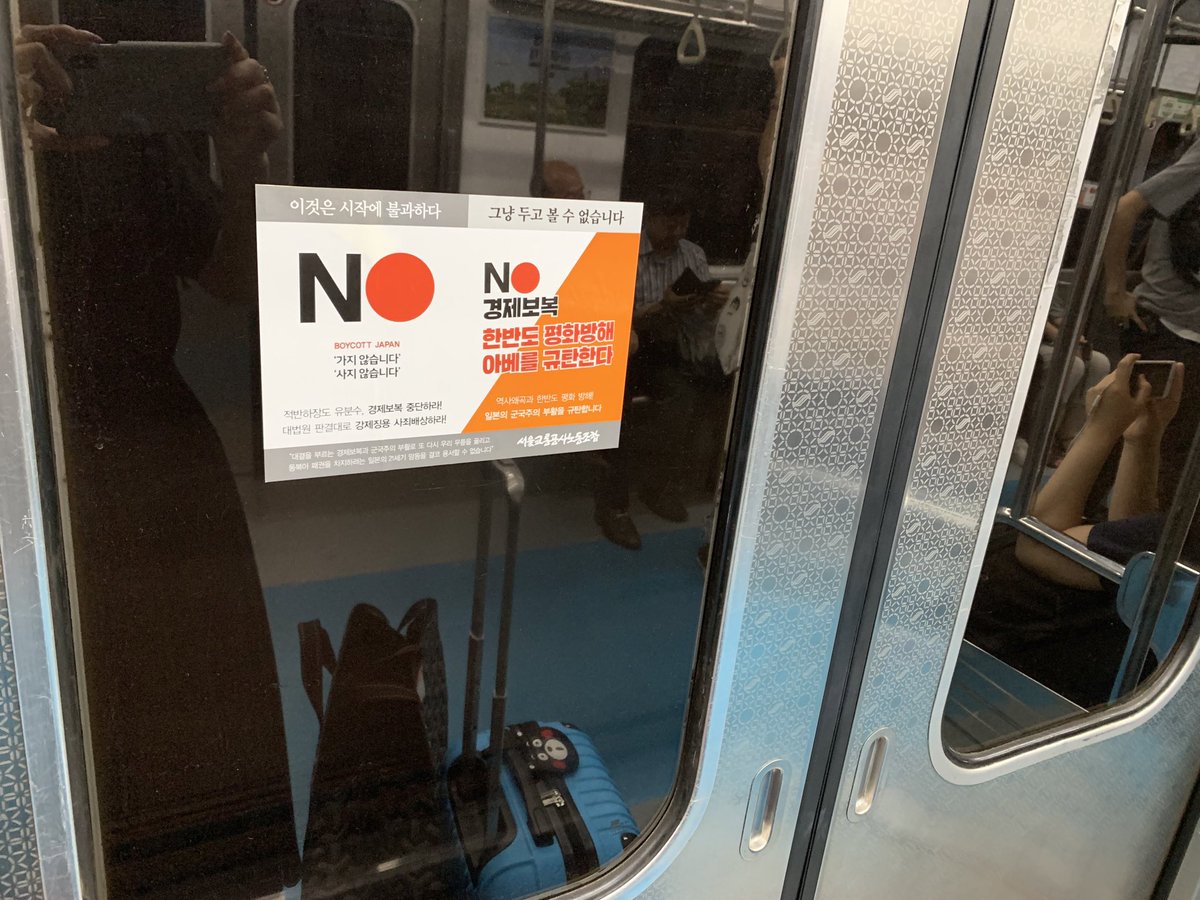 서울 지하철에 일본의 경제 보복 조치를 규탄하는 스티커가 붙습니다.