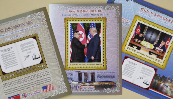 また、北朝鮮は、昨年6・12、シンガポール、第1次米朝首脳会談以後、1年後の昨年6月12日に米・北首脳会談記念切手を発行していたことが分かった。切手には、両首脳の最初の握手、サミット後の共同合意書提唱、氏名専門などを盛り込んでいる。板門店会談が行われる2週間前、キム・ジョンウンの対米(對美)外交」の成果」を誇示するためだと産経新聞は説明した。