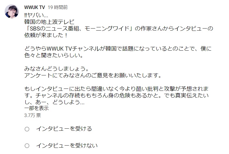 1名無し2019/07/31(Wed) 14:02:06ID:E0MjI4MjY(1/5)NG報告韓国人YOUTUBRの WWUKさん(韓国人から弾圧され中)が韓国の地上波テレビ「SBSのニュース番組、モーニングワイド」の作家さんからインタビューの依頼があったらしい。インタビューを受けるか受けないか悩んでいるらしいhttps://www.youtube.com/channel/UCFyWOIOYgyM9YlJLi3ATr2A/community>>5>>11>>30>>41>>42>>43>>51>>56>>59>>632