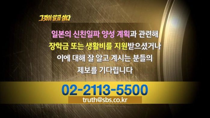 韓国のテレビ局SBSの番組「それが知りたい」の最後に親日派の情報提供求むというテロップが表示された。奨学金を受けとり親日派になっている者の情報提供を、求むというもの。奨学金は500万ウォン(約50万円)が月に2回支給され、年間で1億ウォン(約1000万円)にもなるほか生活費も支給される。