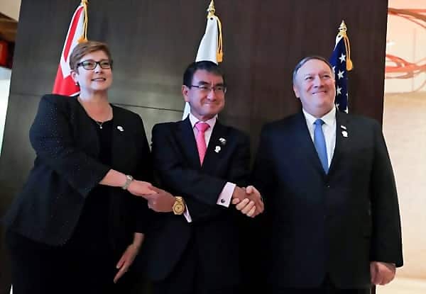 【バンコク=佐堀万梨映】河野太郎外相は1日、ポンペオ米国務長官、オーストラリアのペイン外相とバンコクで会談し、北朝鮮の完全非核化に向けた緊密な連携を確認した。自由で開かれたインド太平洋構想実現のため質の高いインフラ投資の推進や海洋保安能力の強化で一致した。米国が各国に呼びかけているホルムズ海峡を航行する民間船舶の安全を確保する有志連合構想は議題にならなかったという。