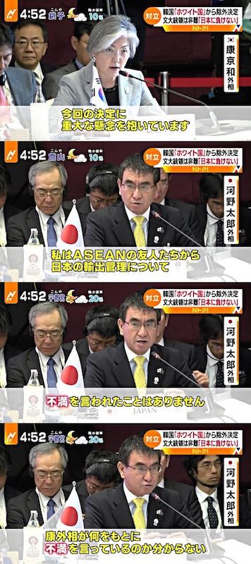이에 고노 외무상은 반론권을 얻어 한국이 한일 청구권협정을 다시 쓰려 한다고 비판하면서도 수출 통제는 이와 별개의 사안이라고 주장했다. 예상치 못한 제3국의 비판에 고노 외무상은 다소 당황한 모습도 보인 것으로 전해졌다.
