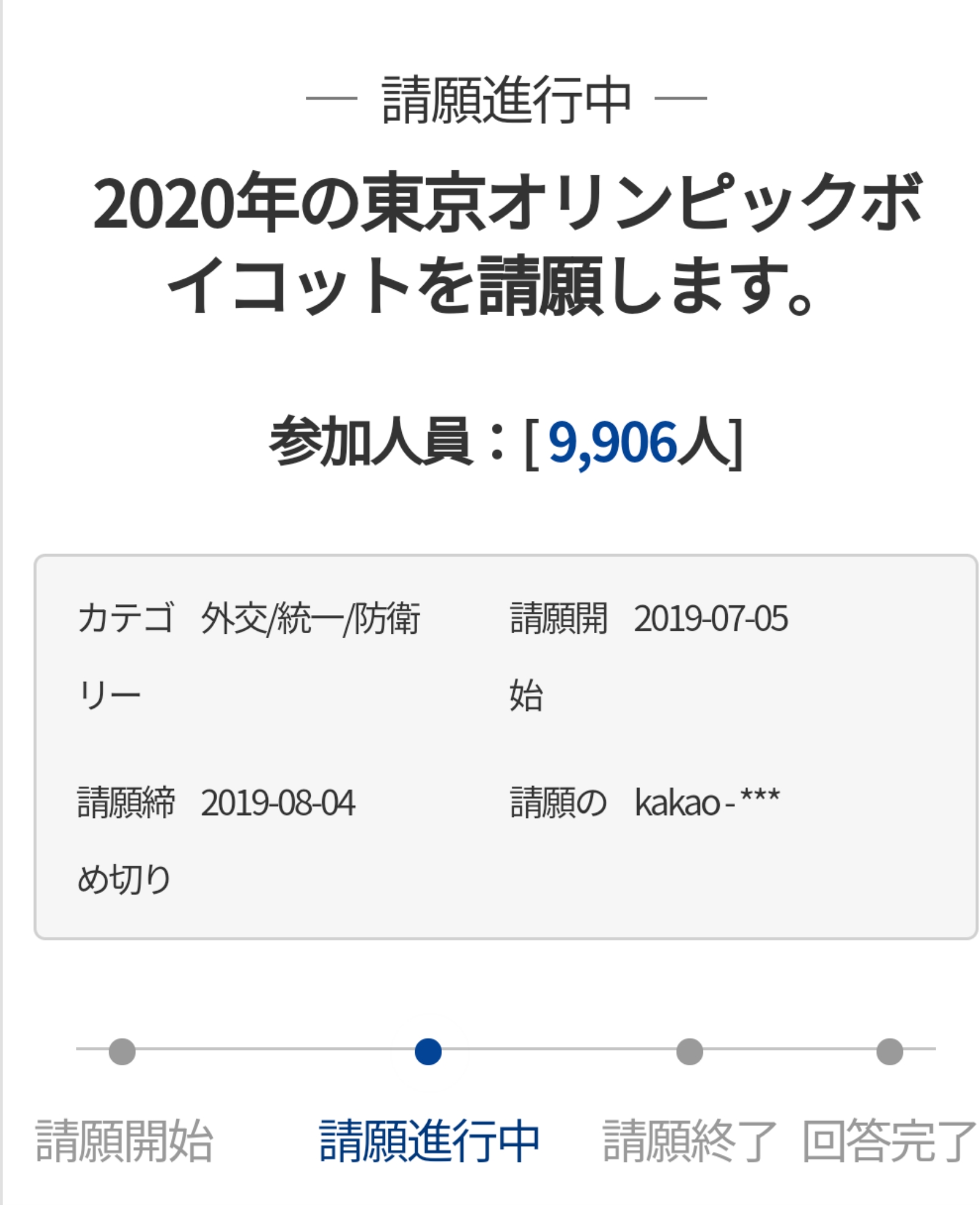また、ある請願人は「アベがこの前、福島農産物をオリンピック選手団らの食材にすると発言した。私たちの選手たちを死なせるわけにはいかない。輸出規制で先に(日本が)刀を選んだが私たちにはもっと大きな刀がある。不買運動に東京オリンピック不参加で世界的な風を起こさなければならない。東京オリンピックの代わりに国内で自らの全国体育典を運営し、選手たちの才能を発揮させるようにしよう」と明らかにした。この請願も4千人余りの同意を得た。