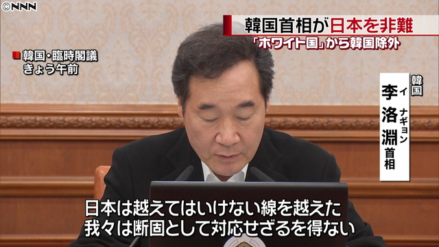 韓国の李洛淵首相は3日、臨時の閣議を開き、日本政府が輸出管理の強化をめぐり「ホワイト国」から韓国を除外したことについて「越えてはいけない線を越えた」と述べ、日本を非難した。