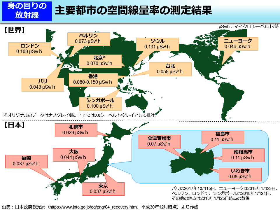 東京都:0.036μSv/h、福島市(福島県):0.13μSv/h