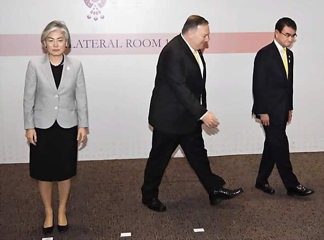政府関係者によると、東南アジア諸国連合(ASEAN)関連外相会議が開かれたバンコクで1日、日米外相が立ち話をして、日韓の問題が話題に取り上げられた際、ポンペオ米国務長官が河野太郎外相に伝えた。