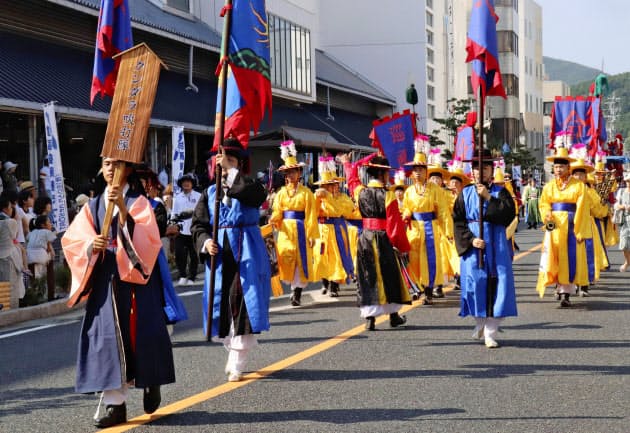 参加者は武士や通信使などの色鮮やかな衣装をまとい、太鼓や笛を響かせながら市中心部を約30分かけて行進。沿道の見物人らはスマートフォンなどで撮影していた。