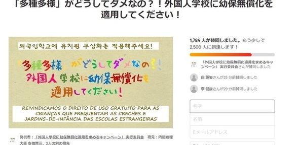 日本政府は「(外国人学校は)乳児教育を含め個別教育に関する基準がなく、多種多様な教育をしている。無償化対象にはなりえない」と主張した。しかし、在日同胞および外国人学校の保護者は、多様な教育をしていることがどうして無償化除外理由になりえるのかと批判している。しかも、日本政府は10月から消費税(韓国の付加価値税に相当)の税率を現行の8%から10%に引き上げ、乳児教育・保育無償化に着手する。乳児教育無償化の主な財源は、在日同胞や外国人も幅広く納める税金である消費税だ。
