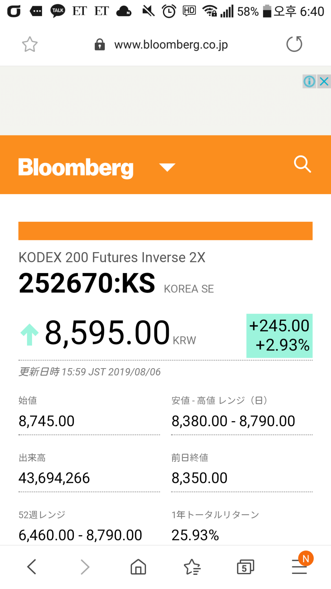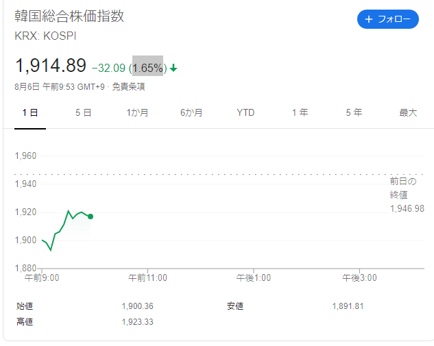 韓国の株は、世界の動きに関係無く、日本と喧嘩しただけで下がる。