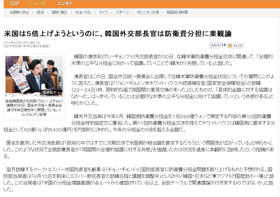 「軍事機密共有協定を継続するなら50億ドルにしてやる。20億ドルは破棄による在韓米軍が受ける対中露北へ対しての脅威の保証損害分だ」とかどうやらGSOMIA破棄に向かって