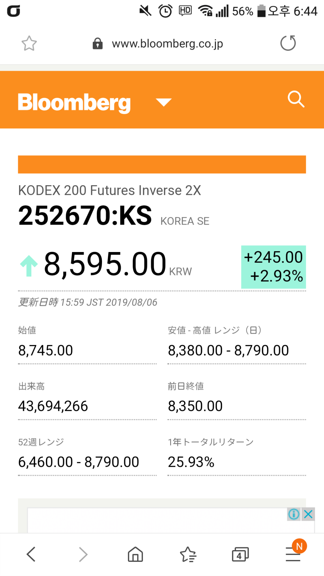 [騰落銘柄] 上昇 160(6) / 焦げ付き 37 / 下落 693(0)https://www.bloomberg.co.jp/quote/252670:KS