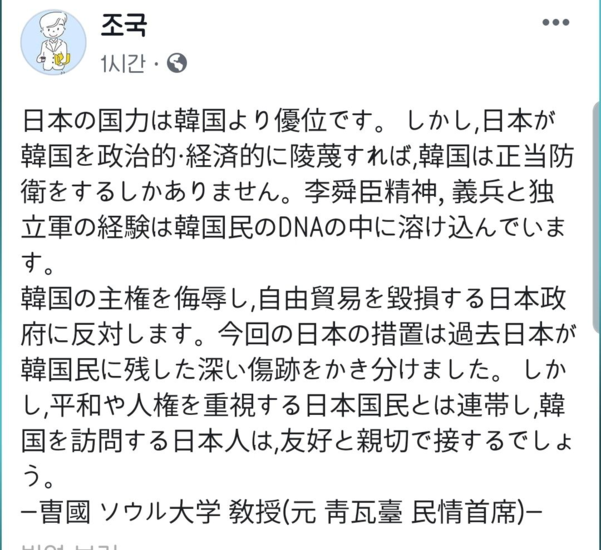祖国前青瓦台民政首席が6日、Facebookに日本語で