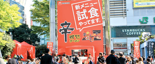 2013년부터는 푸드트럭 '신라면 키친카'를 몰고 일본 열도의 입맛을 공략하고 있다. 매년 봄부터 가을까지 7개월간 일본 주요 도시를 누비며 신라면의 매운맛을 알려왔다. 그동안 이 신라면 전도사가 일본 전역을 누비며 펼친 시식행사는 150여 회로 이동거리만 10만㎞에 달한다. 일본 최남단 오키나와에서 최북단 홋카이도까지 약 15회 왕복할 수 있는 거리다. 다양한 시식 행사를 비롯한 공격적인 마케팅과 중독성 강한 매운맛 덕분에 농심재팬은 지난해 매출 3980만달러(약 453억원)를 올렸다. 이는 2015년 3065만달러(약 348억원)보다 30% 늘어난 수치다. 올해 목표는 4700만달러(약 534억원)로 잡고 있다.