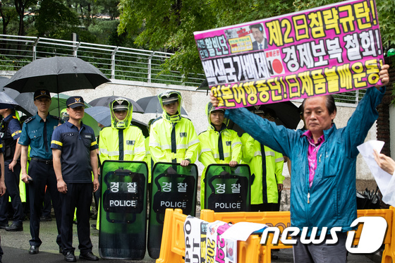ソウル城北警察署は7日午前5時20分ごろ、五千も愛国国民運動大連合代表(53)が城北素材在韓日本大使館の前に乗用車を立ててコチュジャンが混ざった水を投げ抗議デモを繰り広げたと述べた。