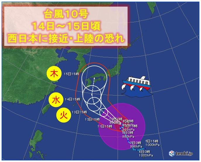 台風10号は、明日8日(木)には強い勢力、10日(土)には非常に強い勢力となって