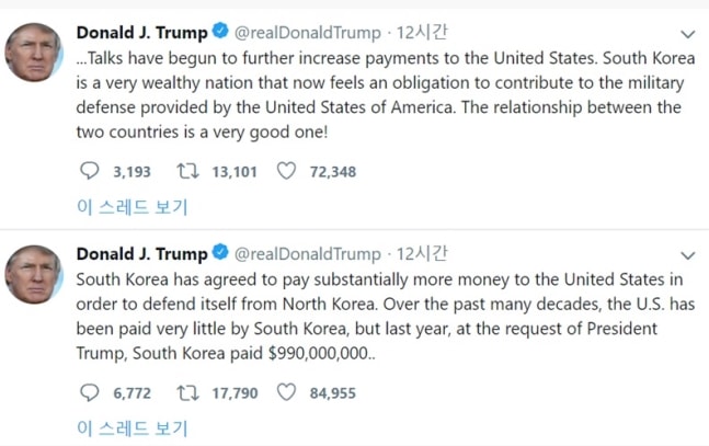 ドナルド・トランプ米大統領が7日(現地時間)「韓国が防衛費をさらに払うことに同意した」と話した。トランプ大統領はこの日、ツイッターで「韓国が自らを北朝鮮から守るために米国に相当多い資金を支払うことで合意した(South Korea has agreed to pay substantially more money)」として「防衛費分担金を増やすための交渉は始まった」と強調した。