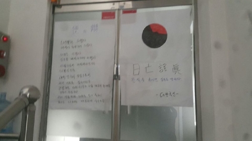 自分を『大韓国人』と書いた犯人は、落書きに「イルマンタジン」〈日亡タ<言+宅>眞[真]〉、〈真実をあざむけば日本は亡びる〉と書いた。