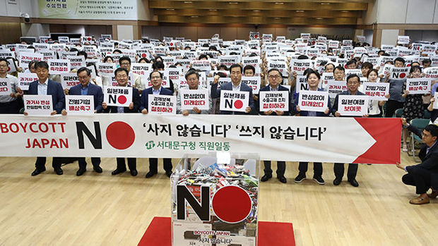 6日には「NO ボイコット日本」と書かれた大量の旗を街頭に掲げたソウル市中区に「日本人観光客は敵ではない」と批判が多数寄せられ、同区は即日、旗の撤去に追い込まれた。