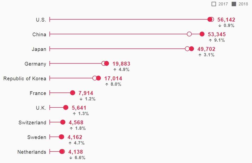 12日業界によると、最近、米国知的財産権者協会(IPO)が発表した『2018年米国特許登録上位300大企業・機関』リストで、
