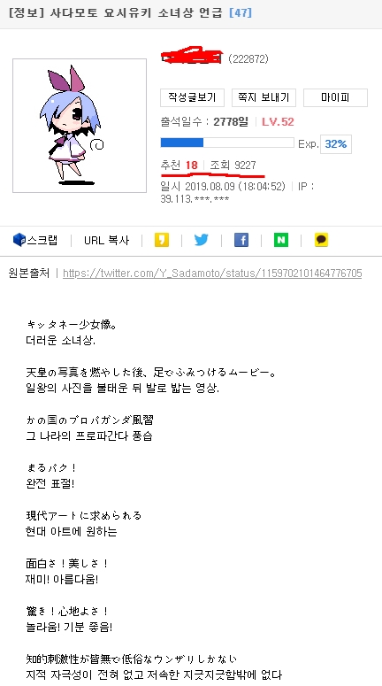 지난 9일 사다모토는 자신의 트위터에 "더러운 소녀상.