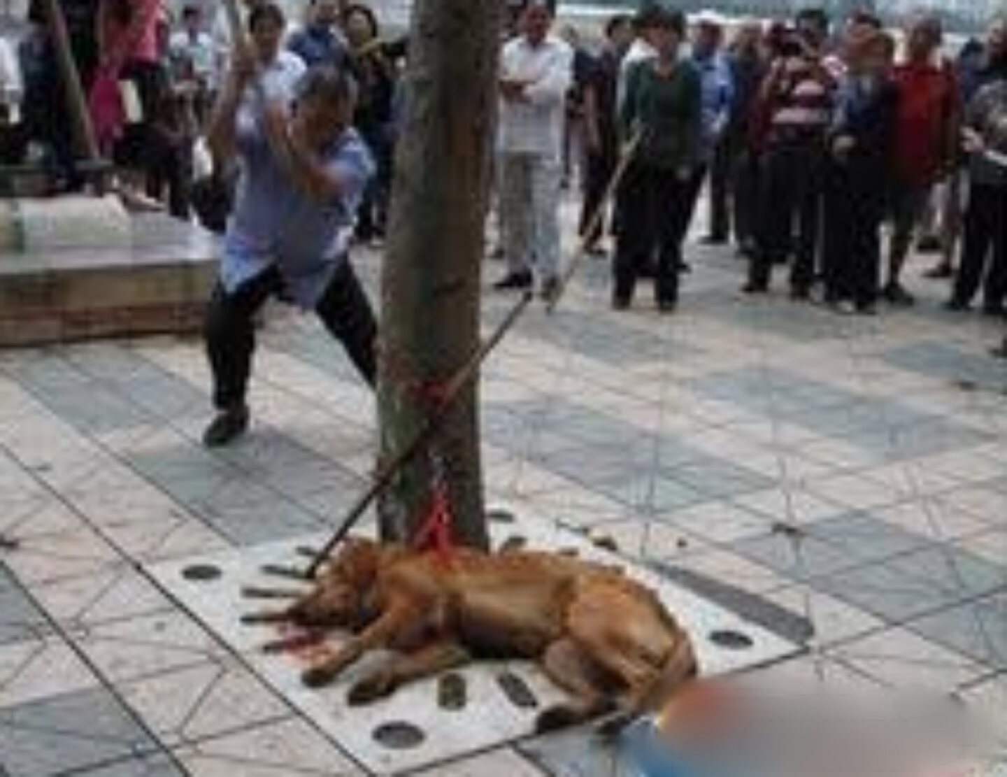 シーズーなどの小型の犬は麻袋に入れ結んだ後、金串であちこちを刺す。こうすると、犬が発狂して死んでいく。この方法は、血がこぼれ出るため、血が滲まずあとの処理がラクだという。