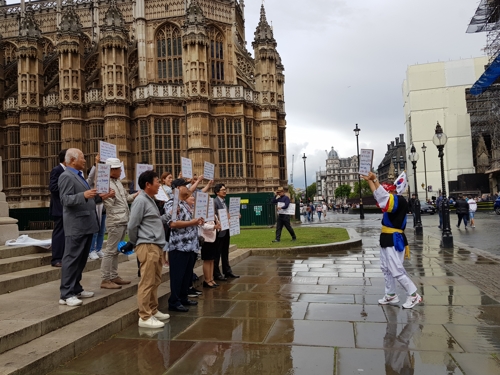 駐英韓国人団体は共同で12日(現地時間)、ロンドン、ウェストミンスター議事堂上院議員の建物近くで、日本政府の経済報復措置を糾弾する集会を開いた。