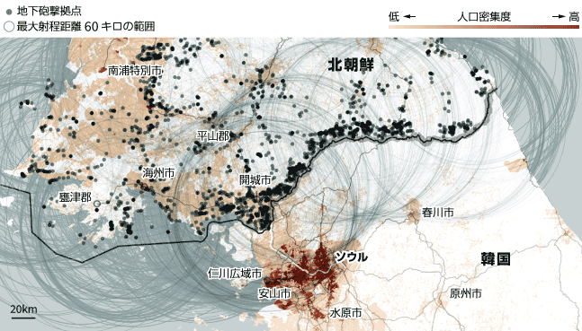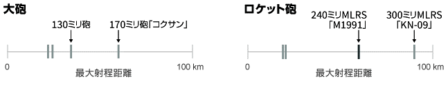 北朝鮮は機動ロケット砲の射程を延ばそうとしている。240ミリ多連式ロケット砲(MLRS)は車両に搭載した発射台から、12発または22発の長距離ロケットを一斉に発射することができる。DMZ付近に配備されたMLRSの射程は60キロでソウルを射程に収める。