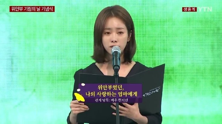 この日、ハン・ジミンは「慰安婦だった私の愛する母へ」という手紙を朗読した。この手紙は、慰安婦被害者のおばあさんの痛みを伝えようと、遺族の話を基に作られた手紙だ。
