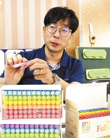 同社の辛亨錫(シンヒョンソク)代表(49)は、塾の数学講師だった十数年前に東京の予備校を見学に訪れた。置いてあったチョークで板書してみると色がきれいで書きやすく、タッチも柔らかくて気に入った。分けてもらったチョークは韓国の塾でも生徒から「見やすい」と好評だった。愛知県春日井市の羽衣文具の製品だった。