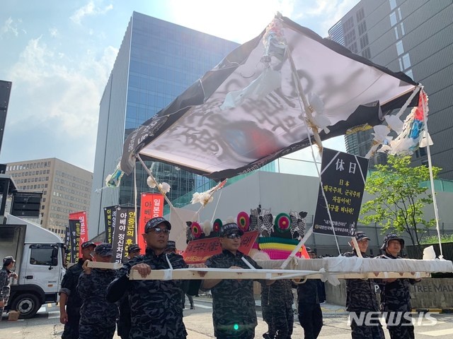 同会はこの日午後、ソウル鍾路区(チョンノグ)旧日本大使館前で集会を開いて安倍晋三日本総理の経済報復を強力糾弾した。同会は「アベ政権の一方的な貿易報復措置は現代版壬辰倭乱も同然だ。日本帝国主義、軍国主義者などは地球から出ていけ」と叫んだ。