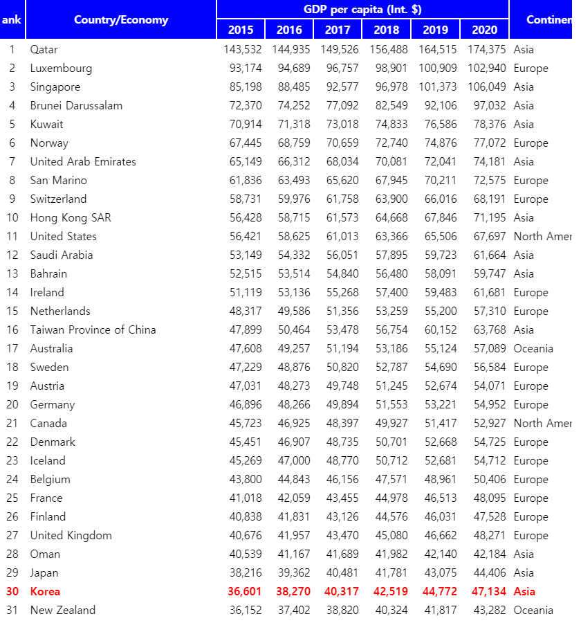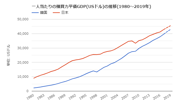2019년 기준으로, 한국이 일본의 1인당 GDP를 추월했네요