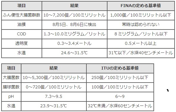 문제는 주최측인 일본도 이 같은 상황을 몰랐던 것이 아니라는 점이다. 도쿄올림픽 준비위원회는 2017년부터 오다이바 해상 공원의 수질 조사를 실시해왔으나 결과는 좋지 않았다.2017년 10월 도쿄도가 발표한 자료에 따르면 2017년 7월 24일부터 8월 9일까지 이 지역에서 검출된 배설물 대장균 수는 국제수영연맹(FINA)이 정한 기준치의 최대 7.2배에 달했다. 국제수영연맹이 정한 배설물 대장균 수는 100ml당 1000개다. 해상에 유출된 기름막인 유막은 같은 기간 두 번 발견되었다. 물의 투명도 역시 0.3m에서 최대 3.4m로 기준치인 0.5m를 초과할 가능성이 높은 것으로 나타났다.