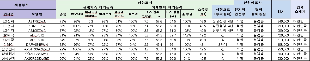 조사결과CADR, ㎥, 표시성능, 준수율, 소음도, 전기적 안전성 적합, 필터 유해물질 불검출, 가격, 국적입니다.>>24
