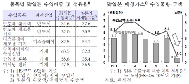 このように、いくつかの品目の対日輸入の割合が大きいほど、これからの日本の輸出規制が継続されている場合は、将来の新産業の非メモリー半導体やエコカーなどの発展が遅れる恐れがあるということが限りの判断である。