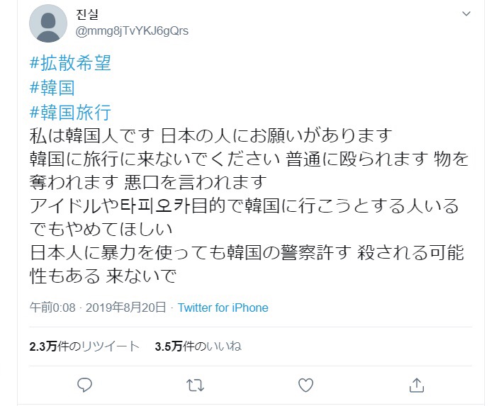 ネトウヨ、韓国人になりすまして「韓国に来たら殺されるから来ないで」とツイート⇒2万RT⇒速攻でなりすましとバレてしまう