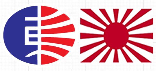 右側の世界に伸びていくことを意味を込めた右の赤い部分が、旭日旗に非常に似ているというのだ。