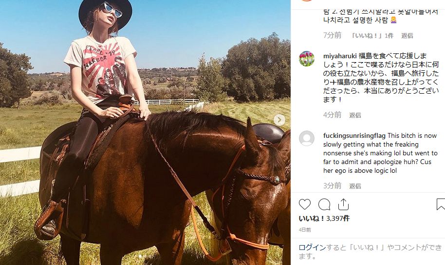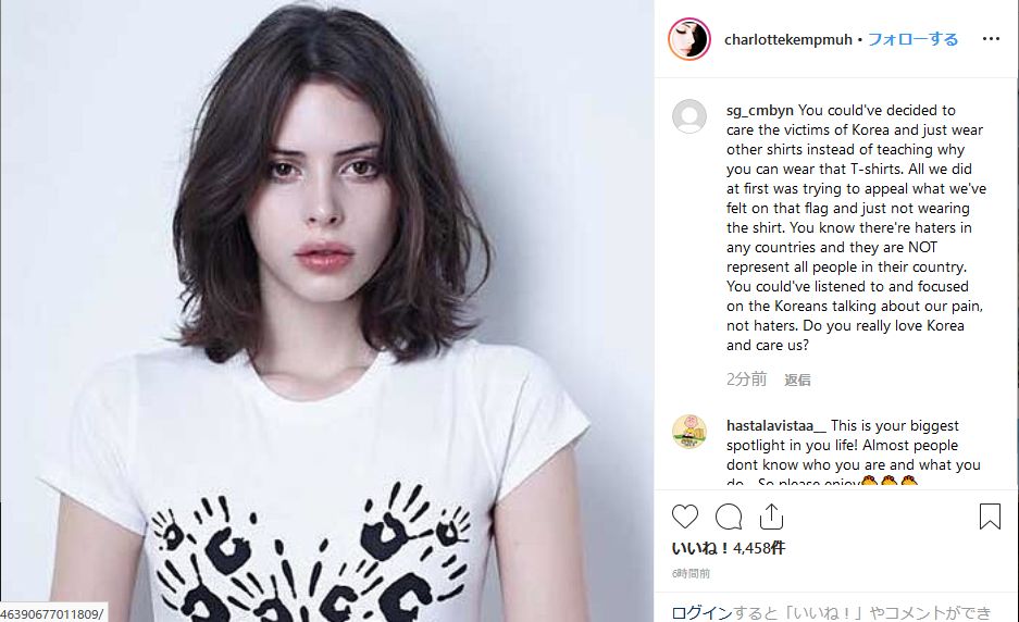 米国モデルシャーロットキャンプミュールが日本軍国主義を象徴する戦犯期」優勢期」(旭日旗)のTシャツを着て、これを指摘した韓国ネチズンたちと舌戦を繰り広げています。